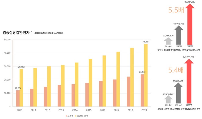 더불어 염증성장질환자는 경제적 부담이 필수 불가결하다. 건강보험심사평가원에 따르면 최근 10년 간(2010~2019년) 궤양성 대장염 및 크론병의 연간 요양급여비용총액은 5.4배, 보험자부담금은 5.5배 늘었다. 염증성장질환의 치료제인 생물학제제는 손상된 장 점막의 회복을 돕고 염증을 줄여 수술 가능성을 낮추는 데 좋은 효과를 보이고 있어 수년간 국내에서 많이 사용되고 있다.