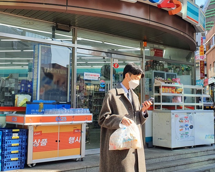 ▲한 직장인이 편의점의 물건을 도보로 배달하고 있다. <사진 제공=자생한방병원> |