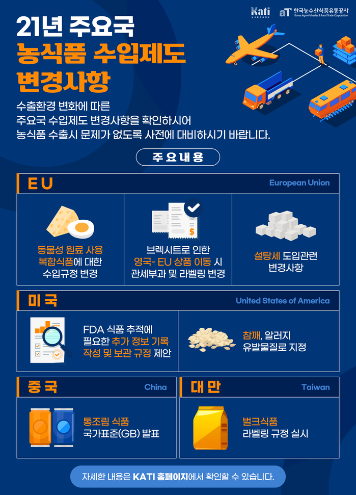 | ▲2021년 주요국 농식품 수입제도 변경사항 인포그래픽.(aT 제공) |