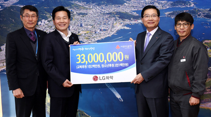 LG화학 여수공장은 지난 27일 여수시장실에서 지역 중고교 신입생을 위한 ‘희망날개 교복나눔’ 사업에 1200만원을, 청소년 결연 사업에 2100만원을 여수시에 전달했다.