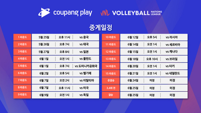 이로써 한국 대표팀은 최소 15개 경기 풀리그를 치르고, 4위 이내의 성적을 달성하면 4강 토너먼트에 진출한다. 6월 24일에 준결승, 25일에 결승전이 예정돼 있다. 쿠팡플레이는 대한민국이 출전하는 모든 경기를 중계함으로써 국내 배구팬들이 편리하게 경기를 시청할 수 있도록 지원한다.