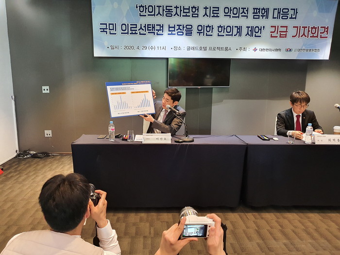 이날 기자회견에서 최혁용 대한한의사협회장은 모두발언을 통해 “최근들어 한의자동차보험 치료를 선택하는 국민들이 늘어나자 한의자동차보험 치료가 과잉진료다, 모럴해저드다 하는 허위·과장 공격들이 많았으나, 2만5000여 한의사들은 국민을 위해 묵묵히 진료에만 열중해왔다”고 말하고 “하지만 보험개발원의 자료와 그 내용을 보고 이젠 도를 넘은 것 같다고 판단해 오늘 긴급히 기자회견 자리를 마련하게 됐다”고 밝혔다.