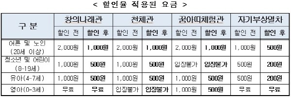 총 6개 전시관으로 구성돼있는 국립중앙과학관 전시관 중 이번에 할인이 적용되는 곳은 국립중앙과학관의 창의나래관, 천체관, 꿈아띠체험관, 자기부상열차 총 4개이며, 나머지 2개는 무료전시관이다.