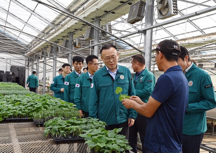 ▲ 안성시는 지난 8일 행정안전부와 합동으로 안성시 미양면 갈전리 46-2에 위치한 조이프러그 육묘장을 찾아 농업 현장의 폭염 대비 상황과 현장 근로자와 외국인 근로자의 안전대책을 점검했다.(안성시 제공) |