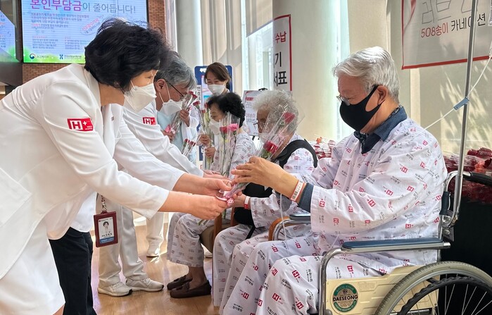 엔데믹 첫 어버이 날을 맞아 8일 관악구 에이치플러스 양지병원 김민기 의무원장과 의료진들이 외래 및 병동환자에게 카네이션 나눔행사 ‘러브 더 카네이션’ 을 펼쳤다.