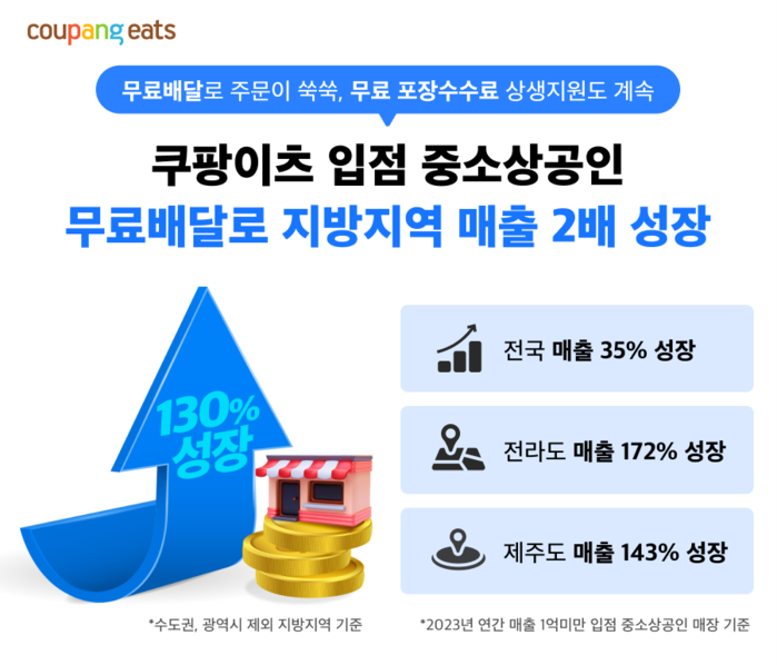 쿠팡이츠가 고객 배달비를 전액 지원하는 무료배달 와우혜택을 시행한지 1개월만에 입점 중소상공인 매출은 지방지역이 2배 이상 올라 큰 폭의 성장세를 기록했으며 전체 매장도 35% 상승세를 보였다고 밝혔다. 음식배달 주문에 허들이 되었던 고객 배달비 부담을 없앤 무료배달 효과로 주문이 늘어 입점 중소상공인의 매출 성장을 견인했다는 분석이다.