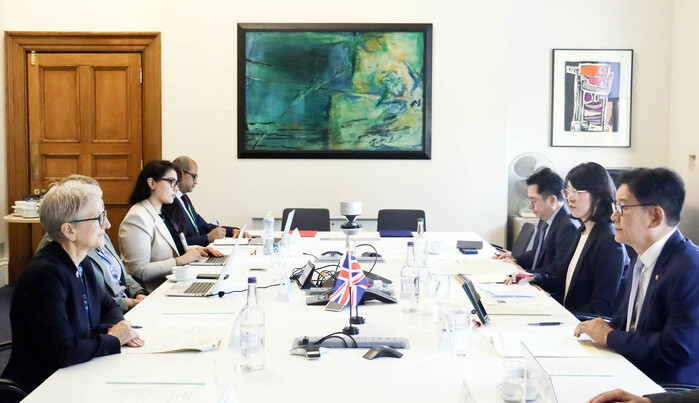 ▲고광효 관세청장(오른쪽 맨아래)이 26일(현지시각) 영국 런던 조세·관세청 본부에서 캐롤 브리스토우 조세·관세청 국경무역실장과 고위급 양자회의를 개최하고 있다, 관세청 제공 |