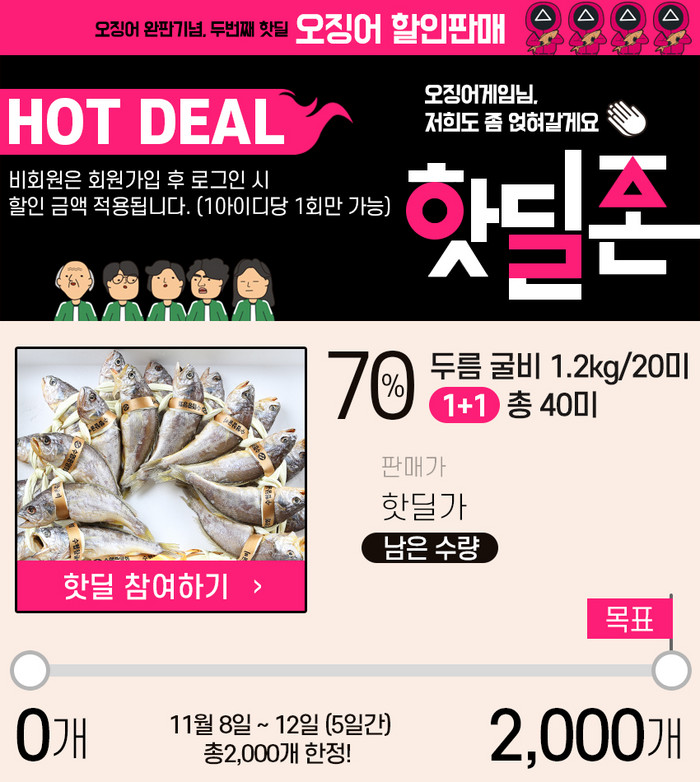 이번 할인전은 제철 수산물 소비를 촉진하고 어가경영을 지원하기 위해 수협이 1일부터 진행 중인 ‘힘내라 어업인!’ 행사의 일환으로, 첫 행사상품이었던 손질오징어는 하루만에 1200세트 완판을 기록한 바 있다.