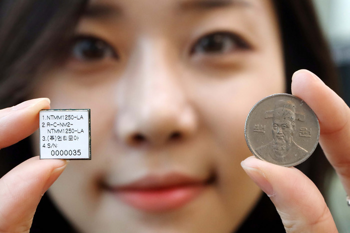 ▲ iUICC 기반의 통신 모듈을 동전 크기와 비교하는 모습. |