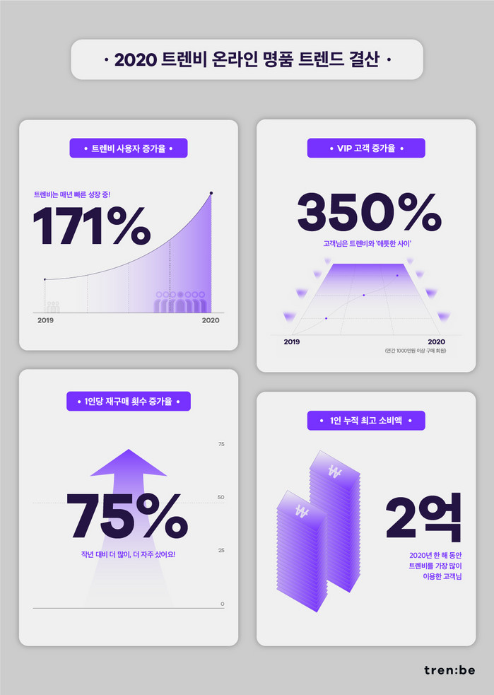 트렌비의 올 1월부터 11월까지 판매 데이터에 따르면, 트렌비 사용자 1인당 재구매율이 무려 75%가량 큰 폭으로 상승했다. 이에 따라 연간 누적 최고 소비액이 전년 5700만원이었던 것에 반해 올해는 2억원 이상인 것으로 나타났다. 연간 1천만원 이상 구매자인 VIP 회원을 칭하는 ‘애틋한 사이’ 고객 수도 전년 대비 올해 350% 증가했다.