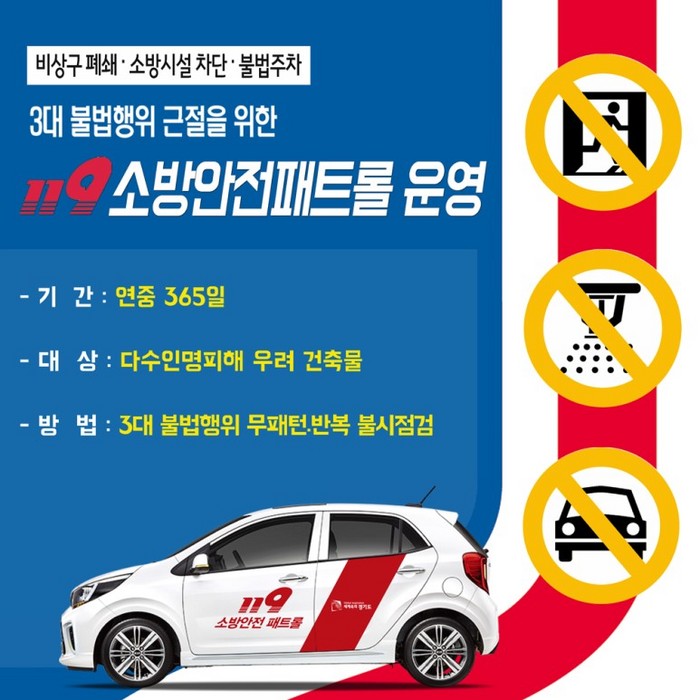 도의 ‘119소방안전패트롤’은 3대 소방 불법행위의 단속과 도민 의식개선을 위해 만들어진 전담기구로, 지난 2018년 2월 발대했다.