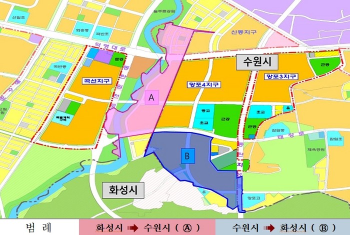 화성시 반정동 일원 398필지가 수원시로, 수원시 망포동 일원 361필지가 화성시로 편입되며 면적은 동일하게 19만8825㎡가 맞교환된다.