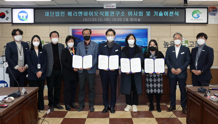 [로컬세계 김경락 기자]전북 고창군 베리앤바이오식품연구소가 지난 10일 고창 군청 2층 상황실에서 연구소와 기술이전 업체 등이 참석한 가운데 ‘연구개발 제품 기술이전 협약식’을 열었다.