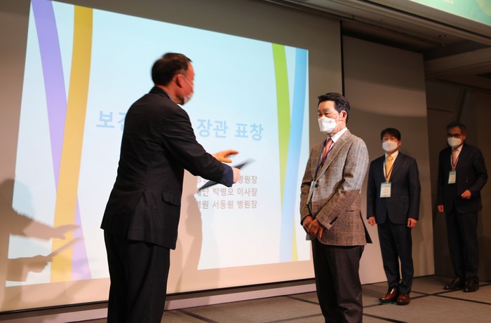 ▲자생의료재단 박병모 이사장이 대한전문병원협의회 정기총회서 보건복지부 장관 표창을 수여 받고 있다. |