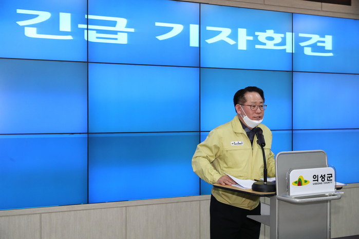 | ▲임주승 부군수가 재난상황실에서 기자회견을 하고 있다.(의성군 제공) |