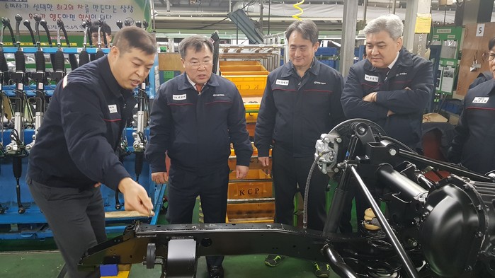 | ▲예병태 대표이사가 평택공장 생산현장을 돌며 직원들을 격려하고 우수개선활동에 대한 설명을 듣고 있다. |
