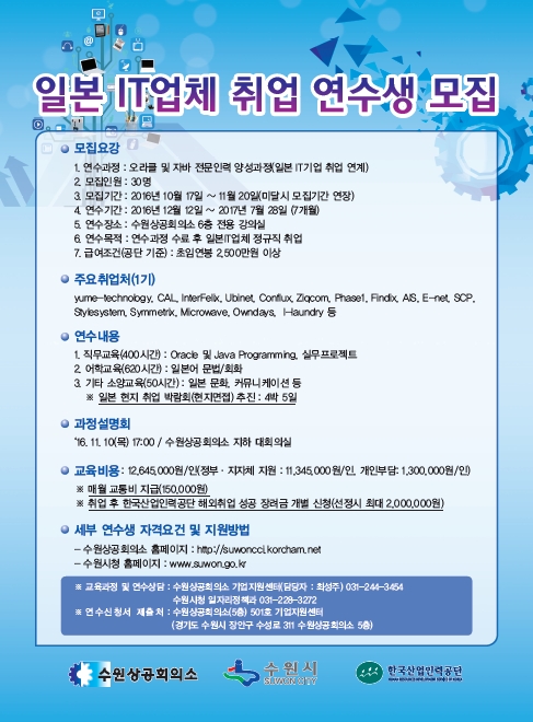 시는 모집 마감에 앞서 11일 오후 5시 수원상공회의소에서 설명회를 열고 ▲해외취업 현황과 일본 고용 동향 및 IT 시장의 전망 ▲취업연수생 모집 요강, 연수생 자격요건, 지원방안 등 청년 해외취업에 대한 사업 소개 ▲일본 현지 기업체의 회사소개 및 채용계획 등 정보를 제공한다.