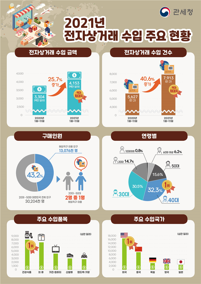 관세청(청장 임재현)은 온택트(On-Tact) 시대를 맞아 늘어나는 전자상거래 수입에 대해 주요 특징을 분석해 '5대 핵심어로 보는 2021년 전자상거래 수입'을 30일 발표했다.