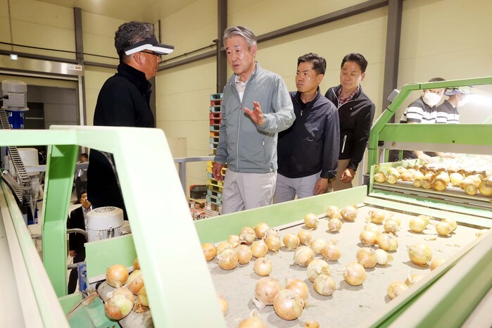 ▲강호동 농협중앙회장(가운데)이 양파 선별시설을 둘러보며 유통현장 점검에 나섰다. 농협 제공 |