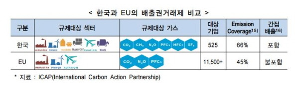 전경련은 “한국의 현행 배출권거래제는 온실가스 감축기술에 있어 상대적으로 경쟁 우위인 EU 대비 규제 대상 섹터·온실가스 범위가 더 넓고 간접배출을 포함하는 등 규제 강도가 강하다”고 밝혔다.