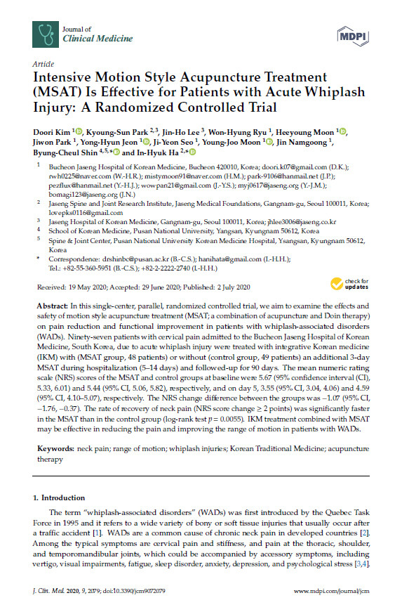 ▲‘Journal of Clinical Medicine’ 2020년 7월호에 게재된 해당 연구 논문 「Intensive motion style acupuncture treatment (MSAT) is effective for patients with acute whiplash injury: a randomized controlled trial」 |