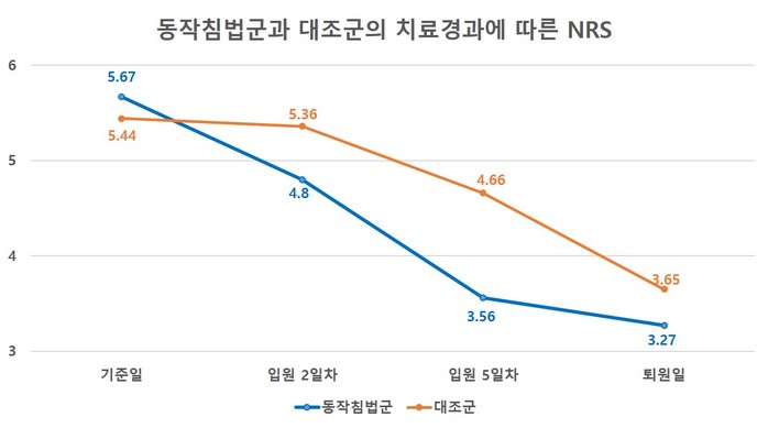연구팀은 동작침법군과 대조군의 통증 차이를 확인하기 위해 입원 2일차 치료 전을 기준일로 잡고 입원 5일차, 퇴원일, 퇴원 후 90일의 NRS를 비교했다. 기준일 당시 NRS는 동작침법군은 5.67±1.17, 대조군은 5.44±1.31로 비슷했다. 3회의 동작침법 치료가 진행된 5일차의 NRS는 동작침법군 3.56±1.51, 대조군 4.66±1.50으로 동작침법군이 대조군 보다 통증 개선 정도가 컸다. 퇴원 당시의 NRS는 동작침법군 3.27±1.67, 대조군 3.65±1.80으로 유사한 결과를 보였다. 퇴원 90일 후 동작침법과 대조군의 NRS는 각각 1.40±1.43, 1.36±1.46으로 두 군 모두 일상생활에서 통증을 느끼지 못할 정도로 호전됐다.