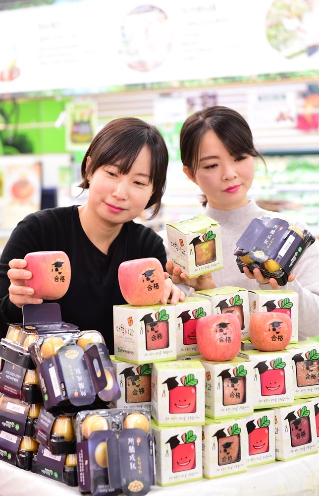 | ▲수능이 10일 앞으로 다가온 4일 서울 서초구 농협유통 하나로마트 양재점에서 고객들이 수능 합격사과와 황금란을 고르고 있다.(농협유통 제공) |