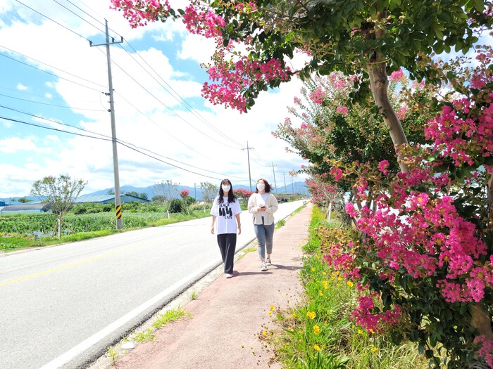 올해 유난히도 지속된 가뭄에 목백일홍이 만개하는데 어려움이 따르지 않을까 많은 주민들이 걱정했으나 이런 우려를 무색하게 하나 둘 피어나기 시작한 목백일홍이 어느새 국도 17호선을 붉게 물들이고 있다.