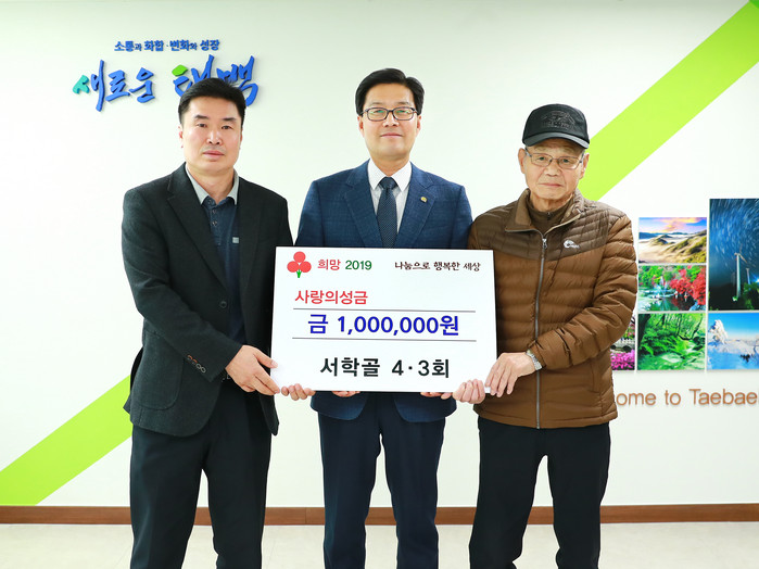 서학골 4.3회는 6일 태백시청을 찾아 사랑의 성금 100만원을 기탁했다.