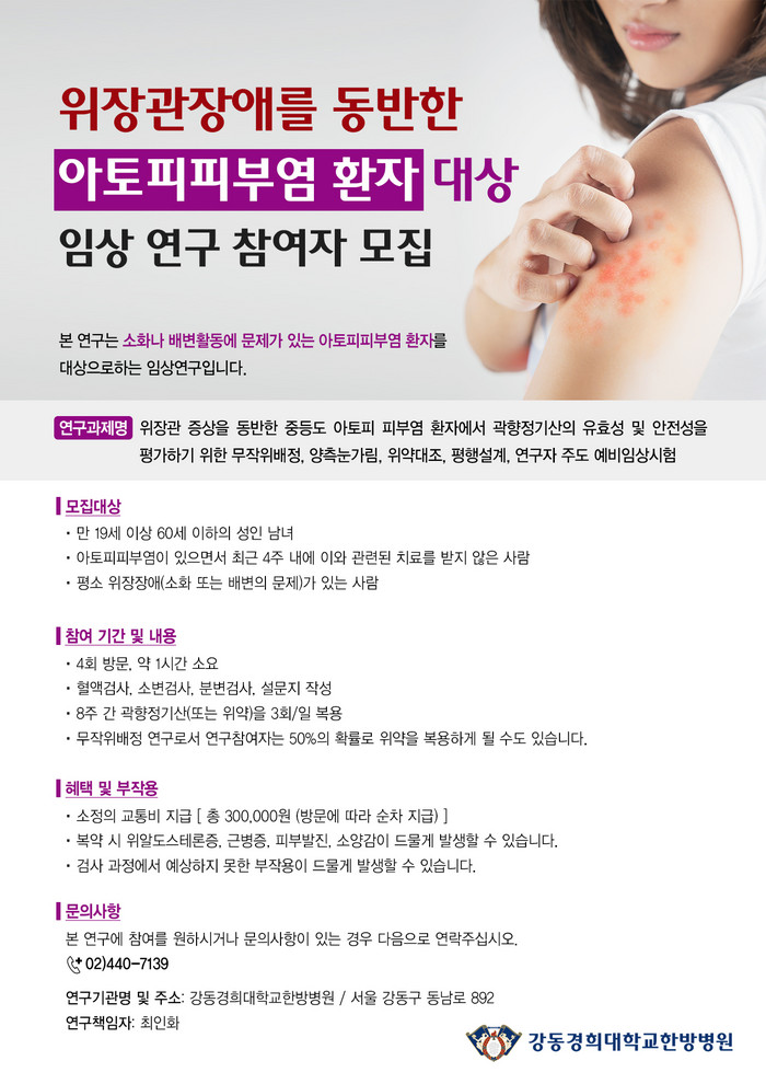 강동경희대학교한방병원 한방안이비인후피부과 최인화 교수팀은 위장관 장애를 동반한 아토피피부염 환자에 대해 곽향정기산의 유효성 및 안전성을 평가하기 위한 임상시험 참여자를 모집한다.