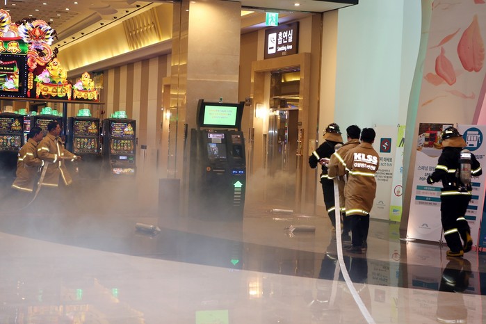 | ▲강원랜드는 15일 정선군 고한읍 하이원 그랜드호텔 카지노에서 영업장 내 화재발생 상황에 대비한 자체 합동 소방훈련을 실시했다.(강원랜드 제공) |