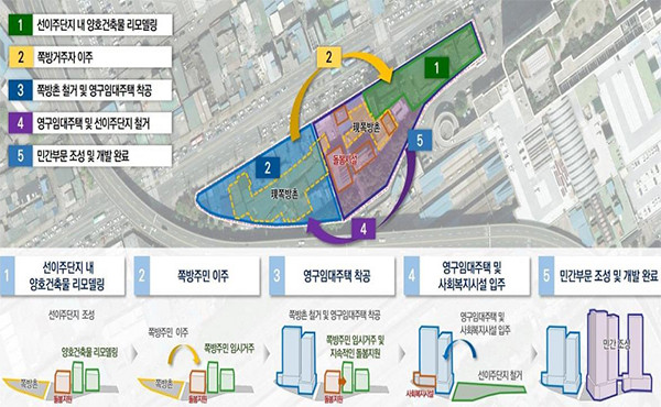이는 먼저 지구 내 기존 건물을 리모델링해 이주단지를 만들어 쪽방 주민이 임시 거주하게 하고 공공주택이 건설되면 돌봄시설과 함께 영구임대주택으로 함께 이주시키는 방안이다.