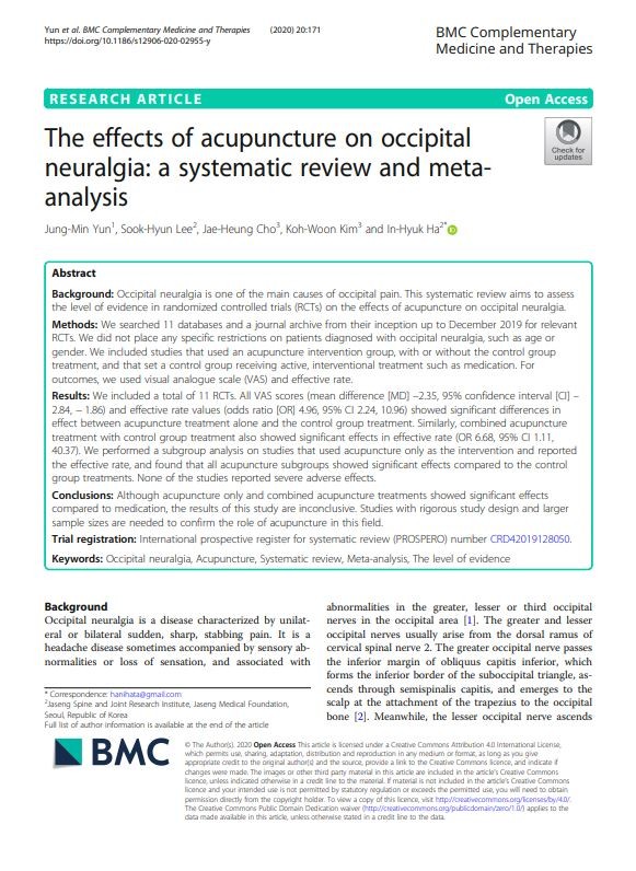 ▲‘BMC Complementary Medicine and Therapies’ 2020년 6월호에 게재된 해당 연구 논문 「The effects of acupuncture on occipital neuralgia: a systematic review and meta-analysis」 |