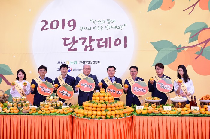 | ▲7일 서울 서초구 농협 하나로마트 양재점에서 열린 ‘단감과 함께 감사의 마음을 전하세요! 2019 단감데이 행사’에서 참석자들이 기념촬영을 하고 있다.(농협유통 제공) |
