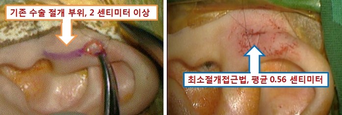 반면 이준호 교수가 개발한 전이개낭종 최소절개접근법은 낭종 구멍을 중심으로 1cm 이하의 절개만으로도 수술이 가능하다. 현미경을 통해 전이개낭종 주머니가 손상 없이 나올 수 있는 최소범위를 계산한 뒤, 정교하게 절개해 낭종 주머니를 꺼내는 방식이다. 절개 범위를 현저하게 줄인 덕분에 흉터도 거의 남지 않으며, 압박드레싱 없이도 수술 후 당일 퇴원할 수 있을 정도로 회복 속도가 빠르다.