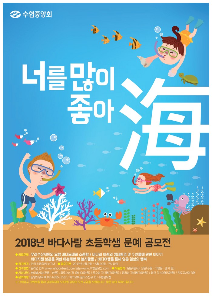 [로컬세계 박민 기자]수협중앙회(회장 김임권)가 ‘2018년 바다사랑 초등학생 문예 공모전’을 개최한다.