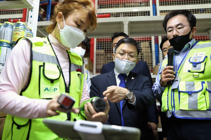 | ▲노석환 관세청장이 18일 인천 전자상거래 국제물류센터(GDC)를 방문하고 업계 관계자로 부터 설명을 듣고 있다. |