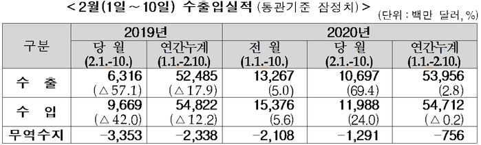 | ▲2020년 2월 1일∼10일 수출입 현황 자료.(관세청 제공) |