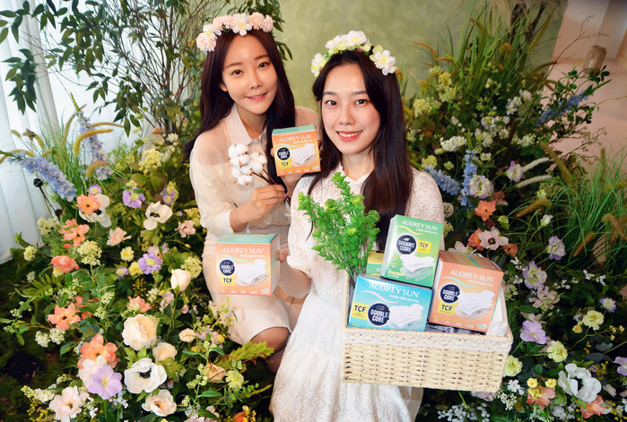 이번에 새롭게 출시한 ‘오드리선 TCF 더블코어’는 안전성을 강화한 친환경 생리대로, 친환경 제조 공법을 적용한 천연 소재를 방수층을 제외한 모든 부분에 사용한 것이 특징이다. 또한 흡수체를 이중으로 적용해 흡수력과 착용감도 높였다.