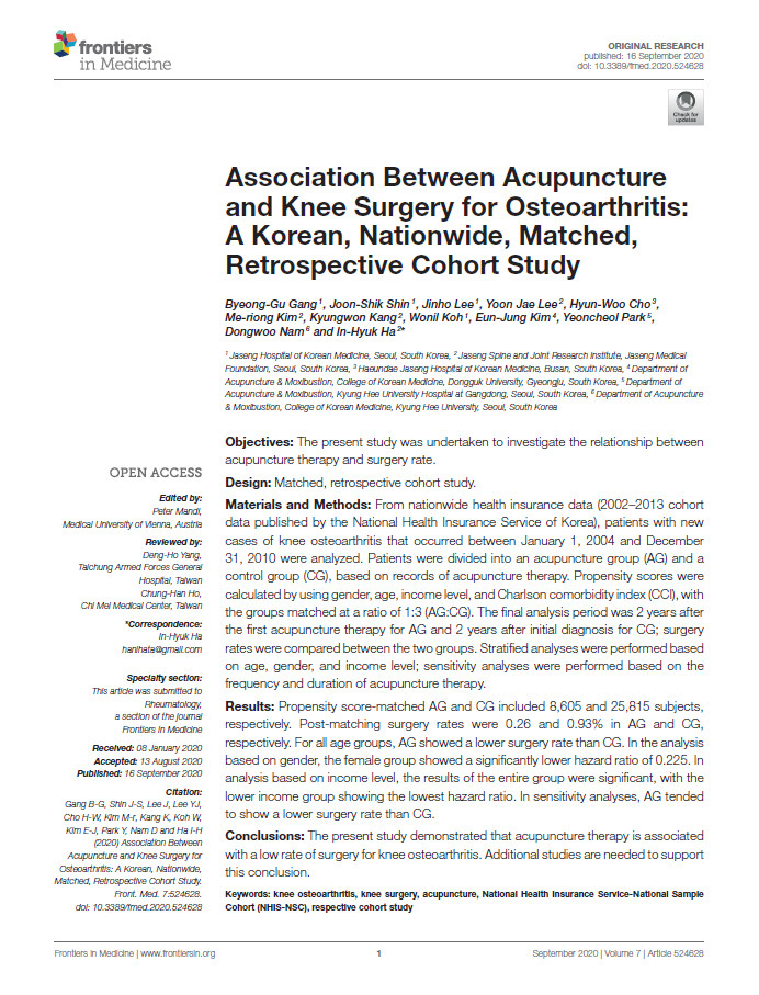 ▲‘Frontiers in Medicine’ 2020년 9월호에 게재된 해당 연구 논문 「Association Between Acupuncture and Knee Surgery for Osteoarthritis: A Korean, Nationwide, Matched, Retrospective Cohort Study」 |