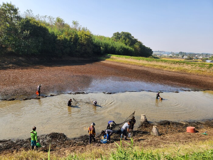 지난 18일 마을 주민들은 저마다 '가래'라고 불리는 전통 어구와 족대를 들고 물이 빠진 저수지(백양제)로 향했다.