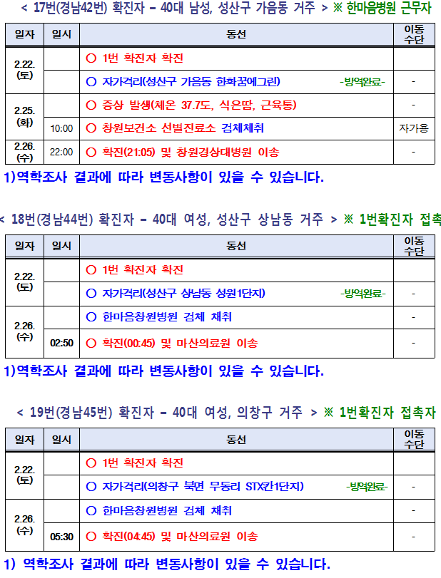 아울러 창원 10번(경남 29번), 창원 12번(경남 31번) 확진자, 창원 13번(경남 32번), 창원 14번(경남 33번), 창원 15번(경남 37번), 창원 16번(경남 40번),창원17번(경남 42번), 창원 18번(경남 44번), 창원 19번(경남 45번) 확진자는 증상 발생 전에 자가격리 중으로 경남도 역학조사관의 판단에 따라 별도의 동선이 없어 역학조사를 하지 않았음을 밝혔다.