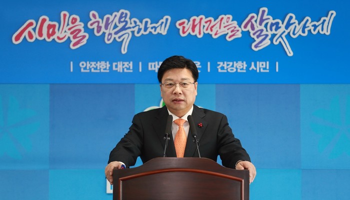 ▲권선택 대전시장이 시정에 대해 브리핑하고 있다. 공직선거법과 정치자금법 위반 혐의로 기소된 권 시장은 2심에서도 당선 무효형을 판결받았다. |