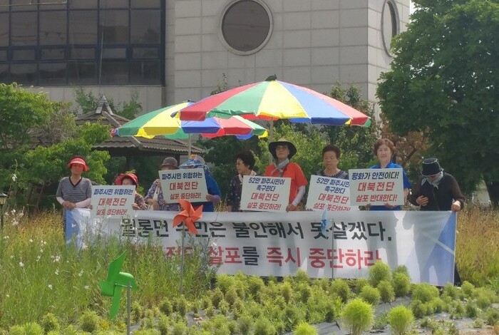[로컬세계 = 임종환 기자]경기 파주시는 지난 20일 밤 탈북민단체 자유북한운동연합이 파주 일원에서 대북전단을 살포한 것과 관련, 월롱면 주민 20여 명이 남북중앙교회 옆 꽃밭에서 오는 7월 21일까지 대북전단 살포를 반대하는 집회를 매일 이어갈 예정이라고 25일 밝혔다.