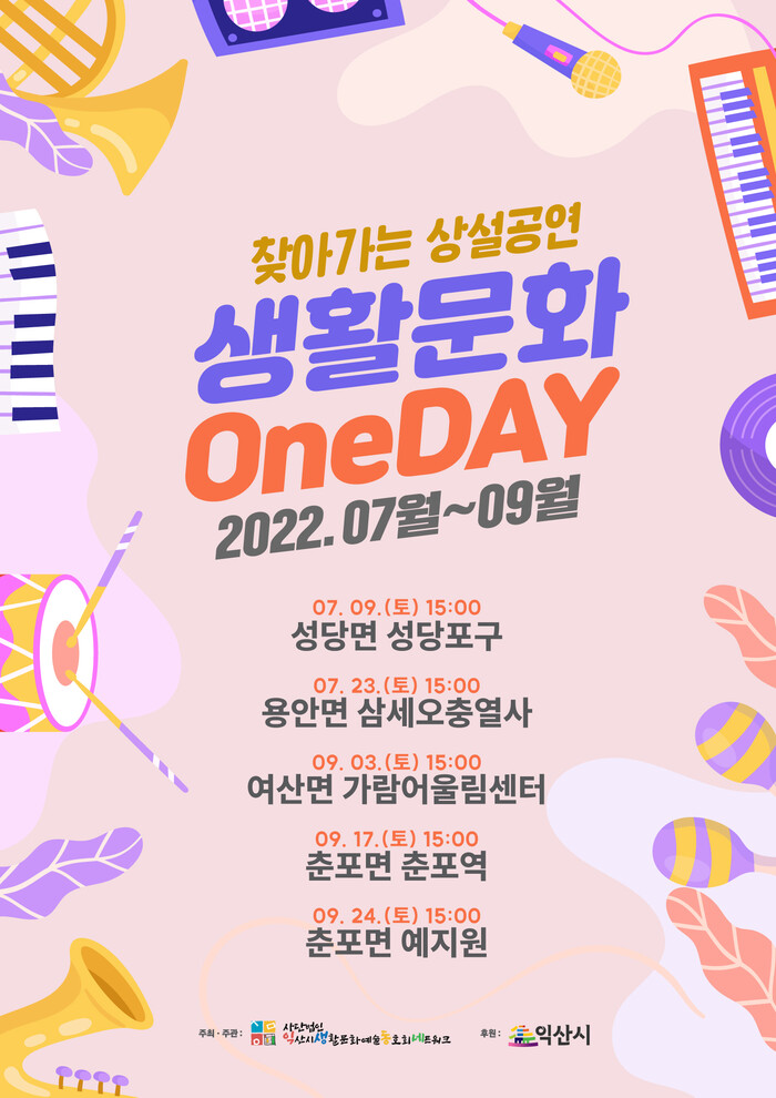 시는 지역의 다양한 문화를 소개하고 생활문화예술 저변을 확대해 지역 주민들에게 문화 향유 기회를 제공하기 위해 ‘생활문화 One Day’를 개최한다 밝혔다.