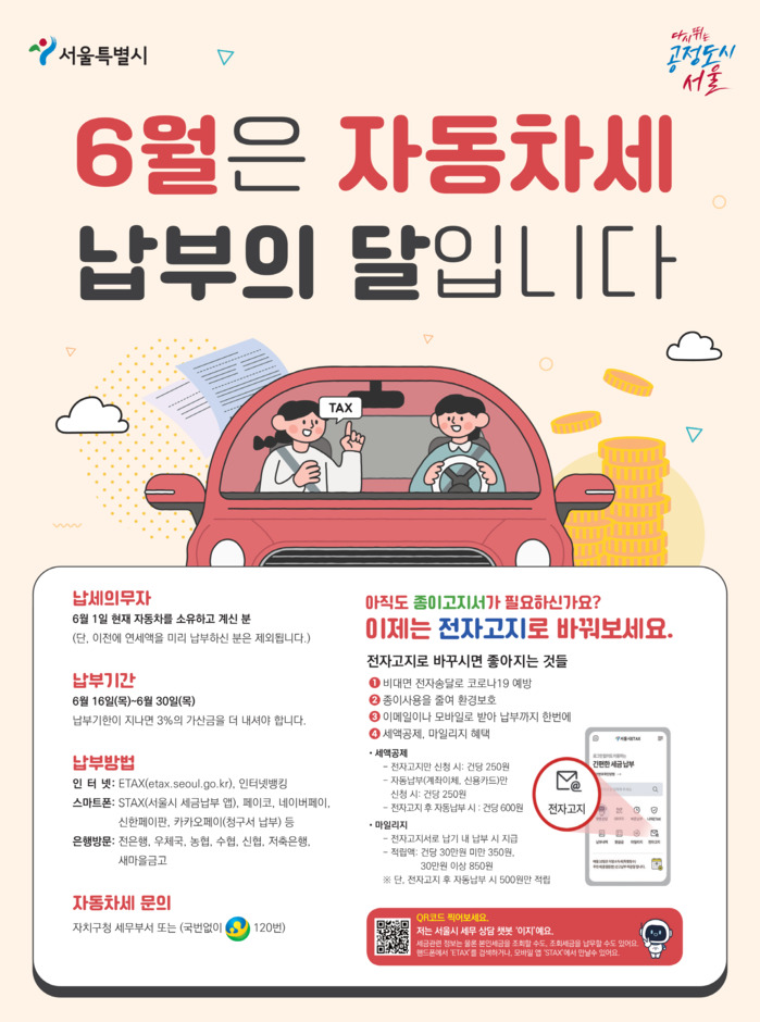 자동차세는 이달 16일부터 30일까지 금융기관, ATM기, 인터넷 또는 포털에서 ‘서울시 세금’으로 접속 후 납부하면 된다. 스마트폰의 ‘서울시 세금납부’ 앱이나 ARS 전화를 통해서도 가능하다.