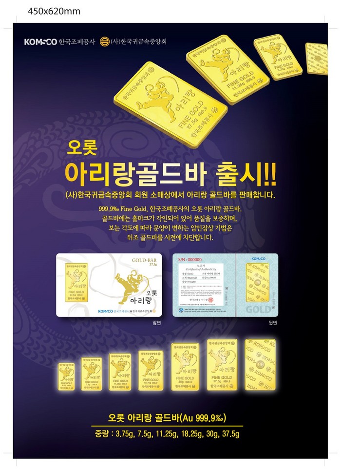 조폐공사 김화동 사장은 “우리 공사가 창립 이래 65년간 축적한 화폐 제조 기술을 집결해 제작한 오롯-아리랑 골드바를 귀금속 골목상권을 통해 판매할 수 있는 계기를 마련했다”며 “국민의 신뢰를 최우선으로 생각하는 공사의 고품질 골드바를 한국귀금속중앙회의 전국 판매망을 통해 공급해 귀금속골목상권의 경쟁력을 한층 높일 수 있을 것으로 기대한다”고 말했다.
