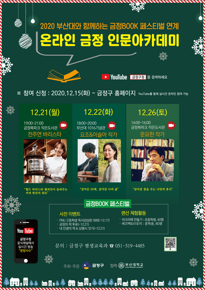 금정구청과 부산대학교 공식 유튜브 채널을 통해 생중계되는 이번 행사는 ‘2020 부산대와 함께하는 금정 BOOK 페스티벌’과 연계, 지역주민들과 소통하고 공감하는 참여형 인문・독서문화 축제로 진행된다.
