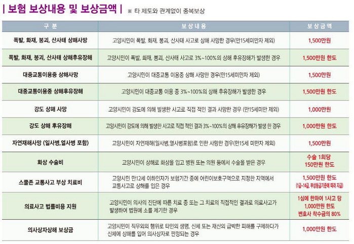 고양시 시민안전보험은 개인보험 가입여부와 상관없이 중복지급이 가능하며, 사고 지역에 상관 없이 고양시에 주민등록이 된 시민은 별도 가입절차 없이 누구나 혜택을 받을 수 있다.