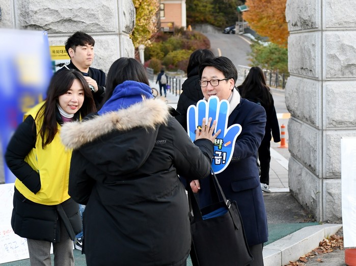 최종환 시장은 응원 현수막을 들고 수험장으로 들어가는 수험생 한명 한명에게 하이파이브를 하며 따뜻한 격려의 말을 전했다.